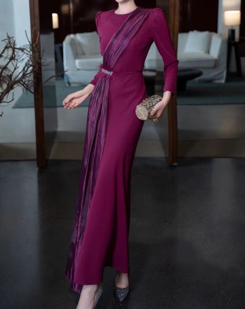 - التصميم: قصة انسيابية أنيقة مع أكمام طويلة ولمسة درامية من القماش المموج.