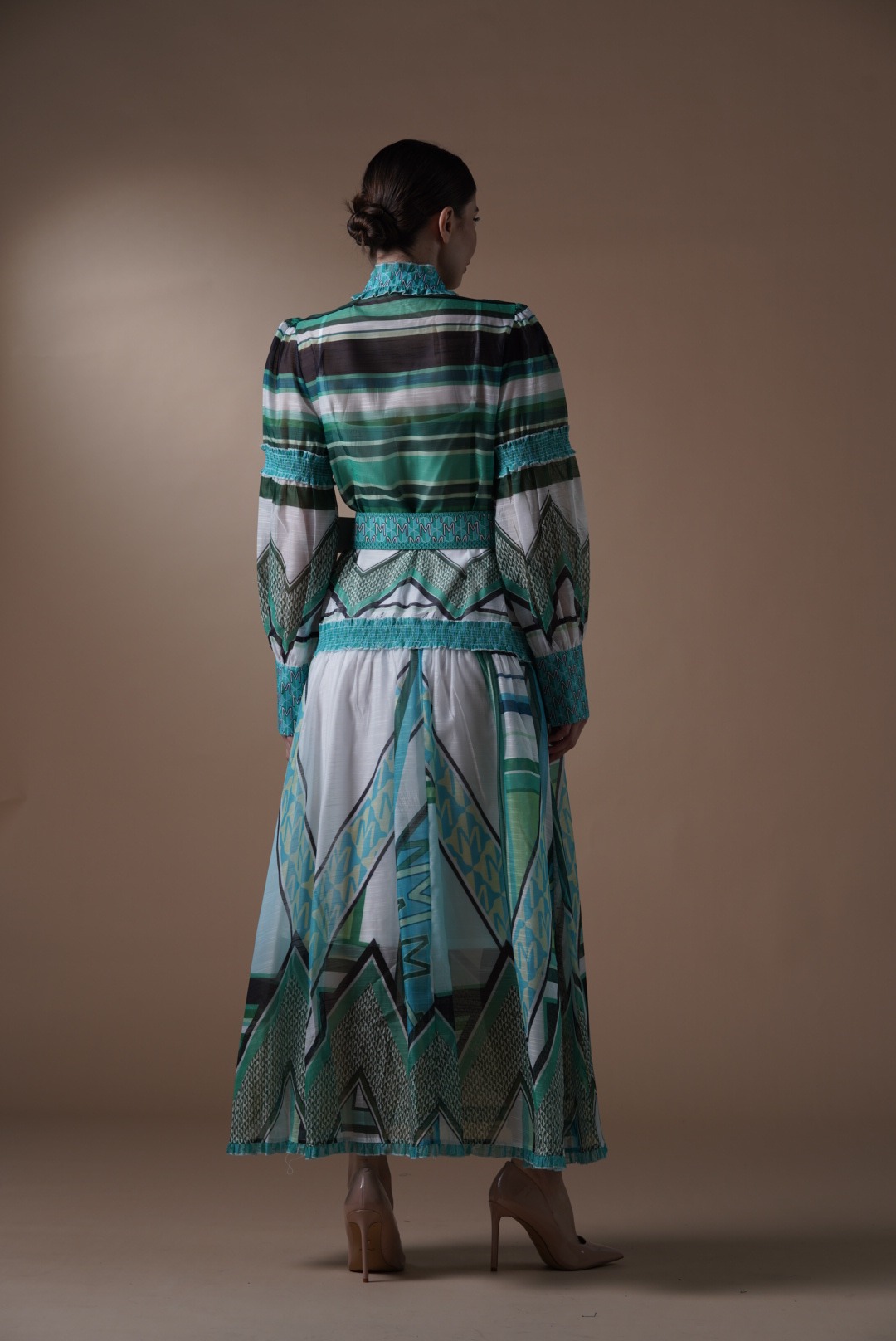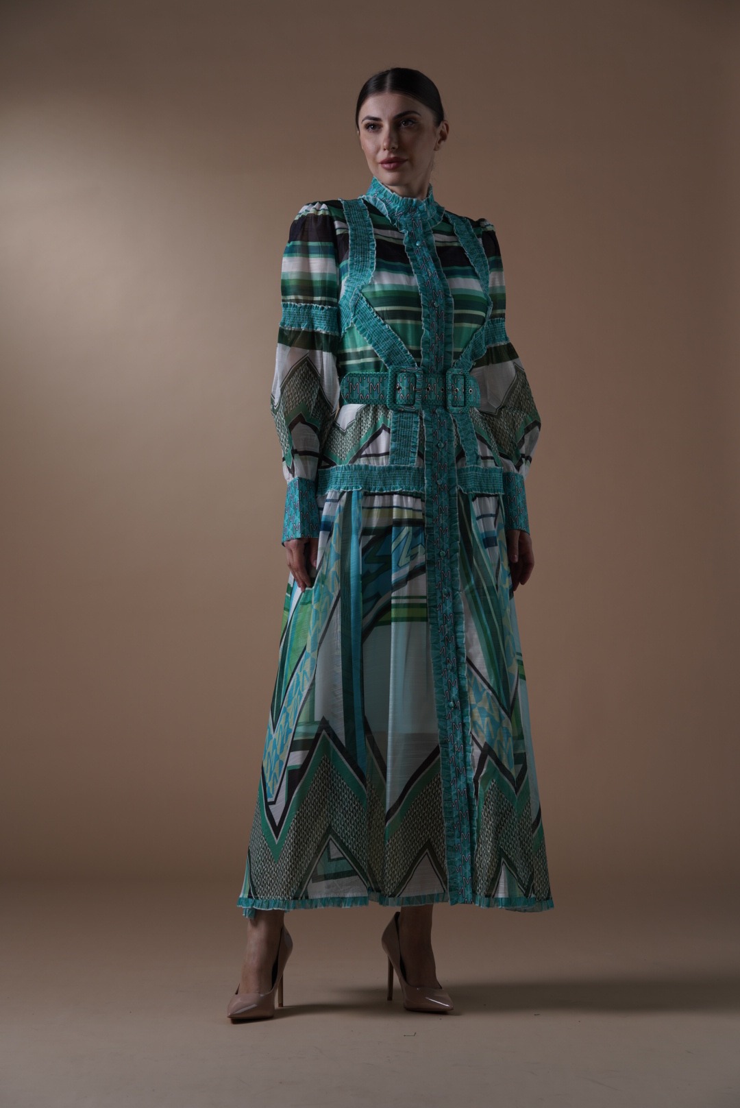 إطلالة ملكية بلون فيروزي نابض بالحياة، تفاصيل النقشات الفريدة والحزام يضيفون لمسة ملوكية