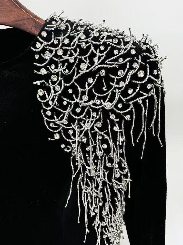 اجمعي بين الفخامة والرقي مع هذا الفستان المخمل الأسود المطرز بخيوط من الخرز، الذي يمنحك إطلالة ساحرة ومميزة في كل مناسبة. يتميز هذا التصميم بلمعانه الراقي ولمسته الناعمة التي تعكس الفخامة، مع تطريز دقيق يضيف لمسة أنثوية جذابة. سواء كنتِ تبحثين عن فستان للسهرات الفاخرة أو المناسبات الخاصة، فهذا الفستان سيضمن لكِ تألقًا لا مثيل له.